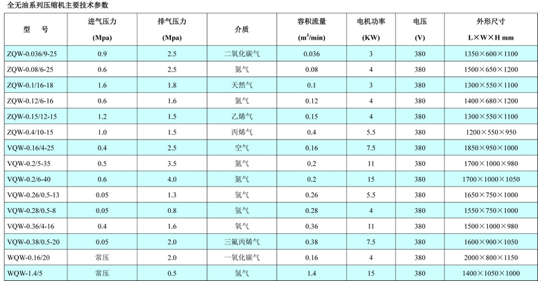 全無油系列壓縮機為往復活塞式。該系列壓縮機為公司自行研制生產(chǎn)的產(chǎn)品。該系列產(chǎn)品具有結(jié)構(gòu)緊湊、振動小、噪音低、運行平穩(wěn)、使用方便、安全可靠等特點。由于該系列產(chǎn)品為全無油潤滑,從而保證壓縮機輸送出去的氣體不含油。全無油系列壓縮機已使用于氮氣、氫氣、天然氣、三氟丙烯氣等氣體的增壓和輸送。